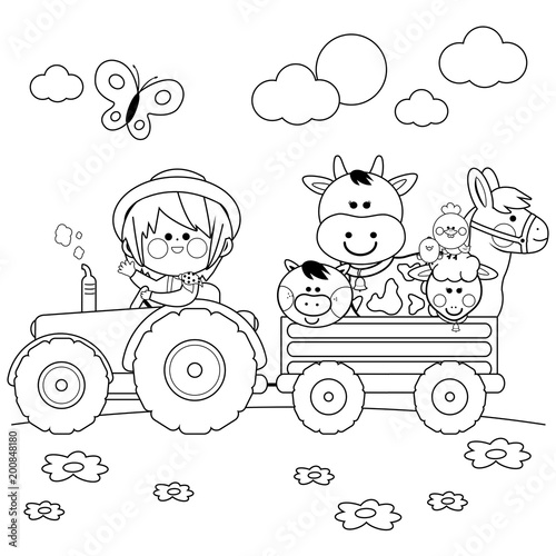 Farmer Boy Driving A Tractor And Carrying Farm Animals Black And