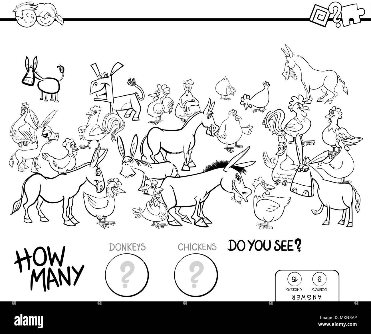 Counting Task With Farm Animals Cartoon Color Book Stock