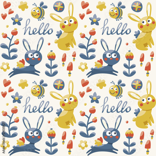 Seamless Cute Pattern Made With Rabbit Hare Bird Flowers