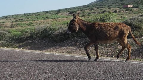 Group Of Wild Donkeys In Countryside Field Animals Crossing Road