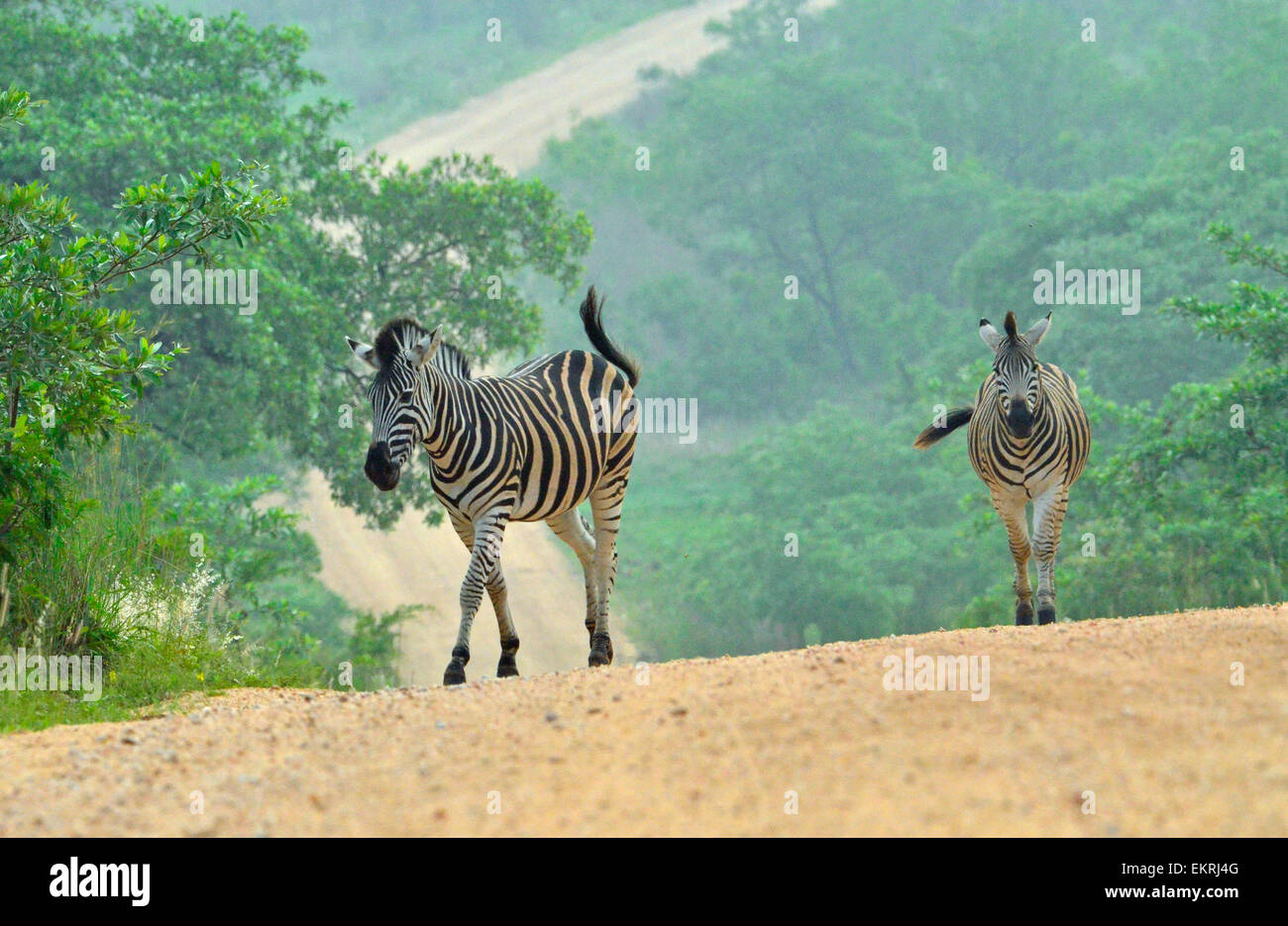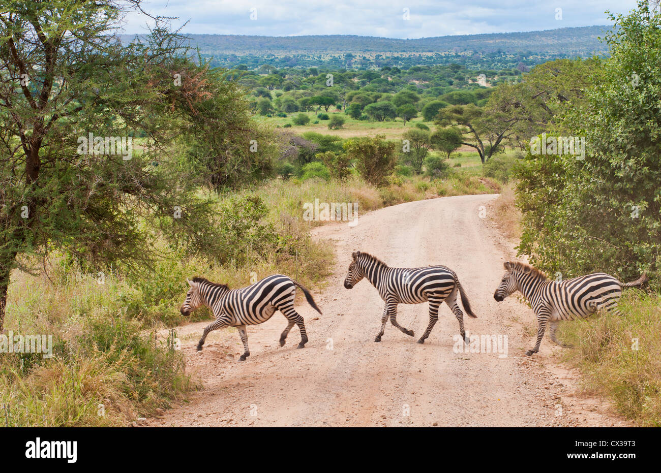Tanzania Africa Tanangire National Park With Zebras Crossing Road